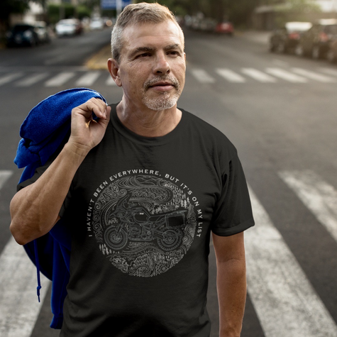 Moto Adventure World t-shirt, from Cannonball Adventure ART DESIGN Our BMW GS 'Moto Adventure World' T-shirt features a favorite motorbike in a beautifully hand-drawn sphere. Nature designs from different landscapes...